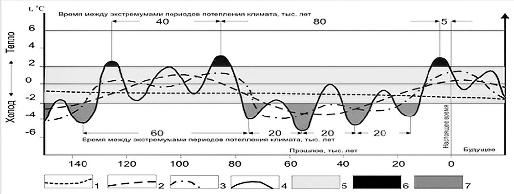 Рис.1. Концептуальна модель інтегрально-динамічного взаємозв’язку між головними глобальними чинниками формування клімату протягом останніх 150 тисяч років: 1 – хід кривої циклу з періодом близько 200 млн років, зумовленого обертанням Сонячної системи навколо Галактичного центру; 2 – хід кривої циклу з періодом 100 тис. років, обумовленого зміною ексцентриситету орбіти Земні; 3 – хід кривої циклу з періодом 40,7 тис. років, зумовленого зміною нахилу вісі обертання Землі у площині екліптики; 4 – хід кривої циклу з періодом 20 тис. років, обумовленого прецесією земної вісі; 5 – область оптимальних кліматичних умов; 6 – періоди екстремального потепління клімату; 7 – періоди екстремального похолодання.