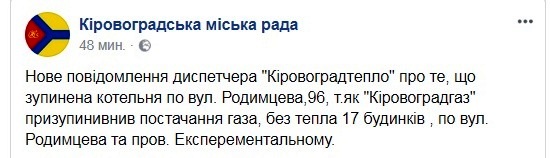 Місцева влада самоусунулась від питання забезпечення кропивничан теплом: хоча з середини жовтня поточного року на міського голову та голову Кіровоградської облдержадміністарції були направлені листи з попередженнями про можливе відключення тепловиробників від газу, жодних заходів для запобігання відключенню місцевою владою не було вжито.