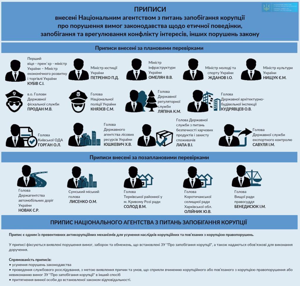 Такі приписи були винесені за результатами проведених планових та позапланових перевірок органів державної влади та місцевого самоврядування з організації роботи із запобігання та виявлення корупції. Приписи внесено Першому віце-прем’єр-міністру України – Міністру економічного розвитку і торгівлі України, щодо посадових осіб міністерства, а також керівникам 4 міністерств, головам 9 інших центральних органів виконавчої влади та керівникам 4 органів місцевого самоврядування.