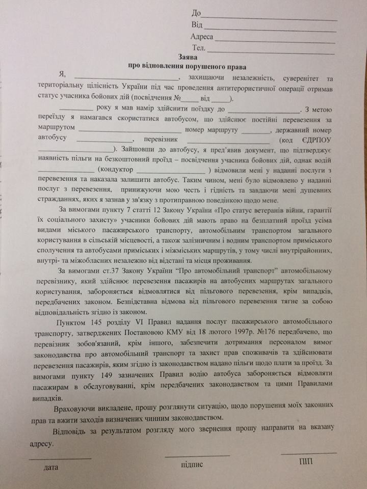 Отже, у випадку порушення Вашого права на пільговий проїзд Ви можете звернутись за захистом свого права із заявою або скаргою (зразок додаємо) до працівників поліції або до територіального управління Державної служби України з безпеки на транспорті для відновлення порушеного права.