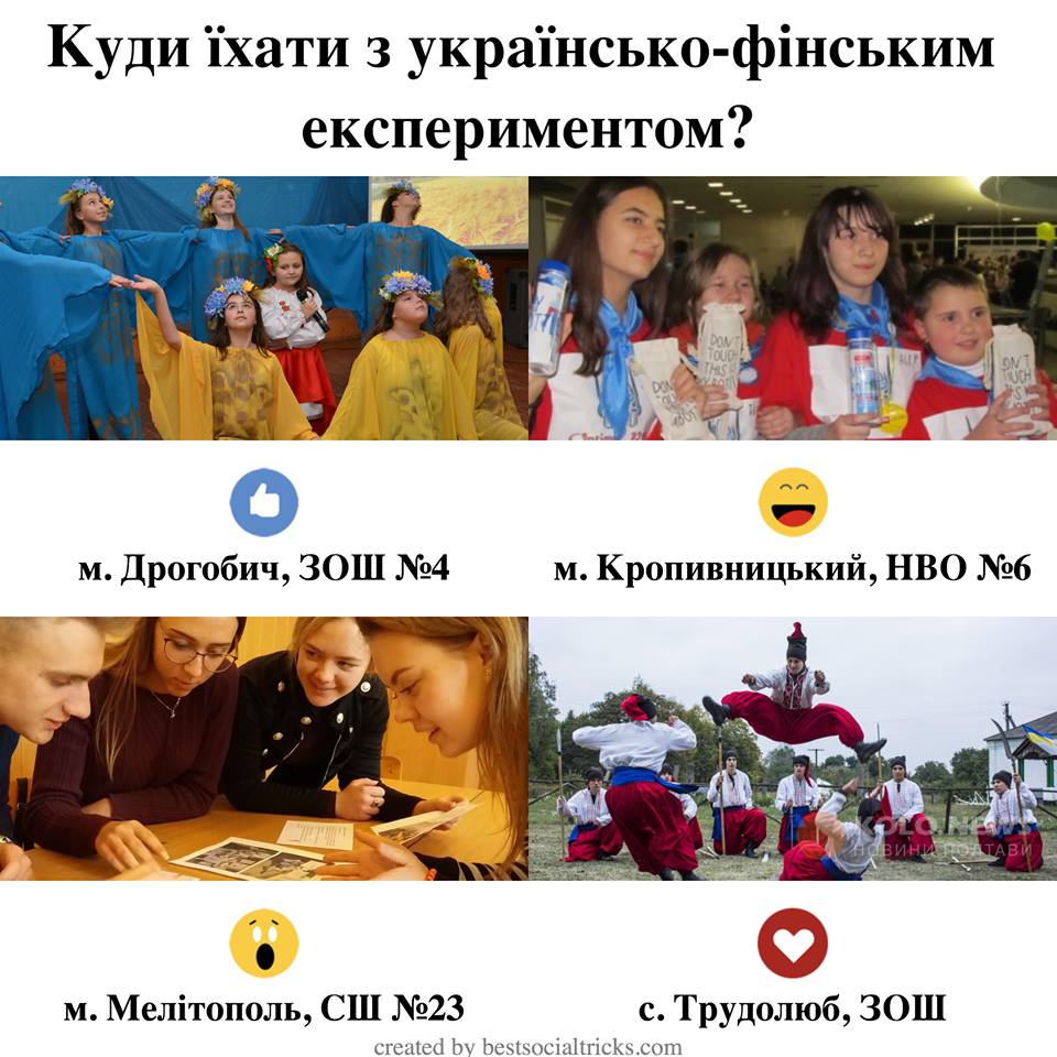 «Мета проекту — довести, що основу справжніх змін можна закласти в дуже короткий термін. Ознайомтеся з чотирма школами і поставте під цим постом https://www.facebook.com/edcampukraine/posts/1584225668359287 позначку, яка відповідає обраній вами школі – «вподобайку», «серце», «усміхнений смайлик» чи «здивований смайлик».