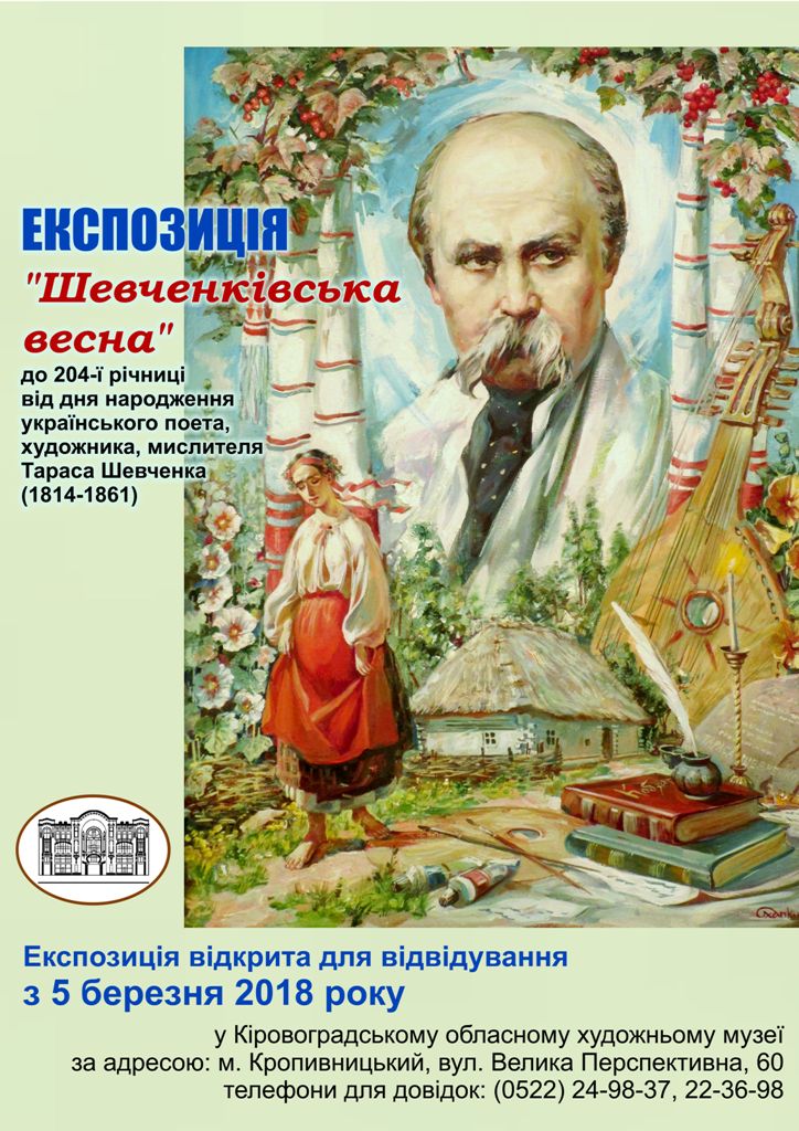 5 березня 2018 року в Кіровоградському обласному художньому музеї розгорнуто експозицію творів «Шевченківська весна» до 204-ої річниці від дня народження геніального українського поета, художника, мислителя, пророка національного відродження України Тараса Григоровича Шевченка (1814-1861).