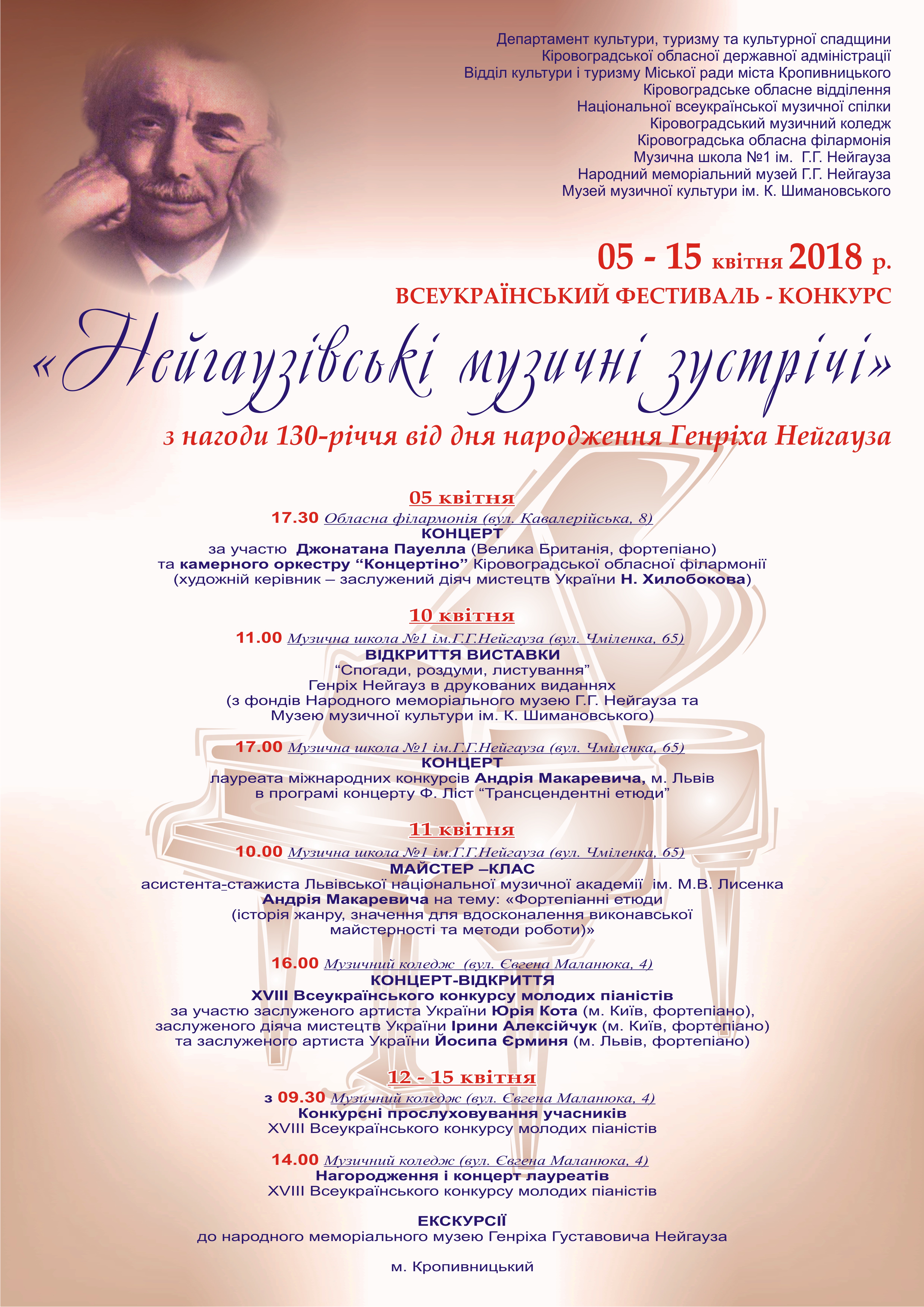 11 квітня о 16.00 відбудеться концерт-відкриття ХVIII Всеукраїнського конкурсу молодих піаністів у рамках фестивалю “Нейгаузівські музичні зустрічі” за участю заслуженого артиста України Юрія Кота (м.Київ), заслуженого діяча мистецтв України Ірини Алексійчук (м.Київ), заслуженого артиста України Йосипа Єрминя (м.Львів).