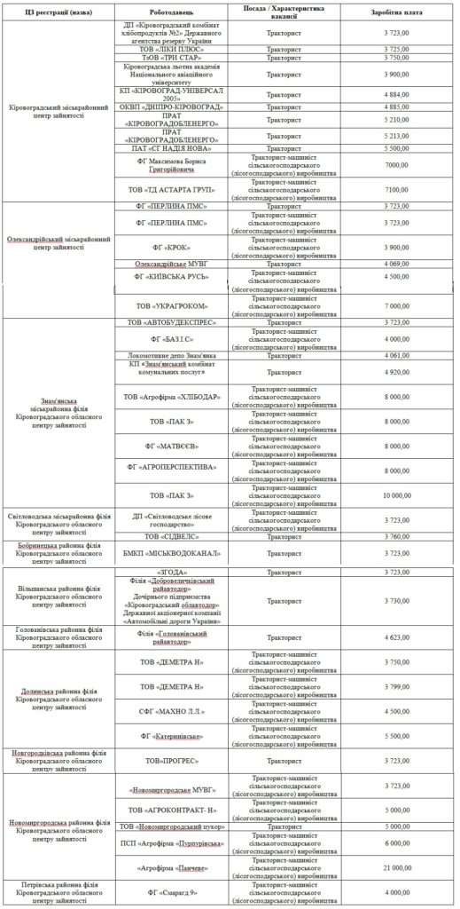 Станом на початок червня, роботодавці Кіровоградщини представили 46 вакансій за професіями «тракторист» та «тракторист-машиніст сільськогосподарського виробництва».