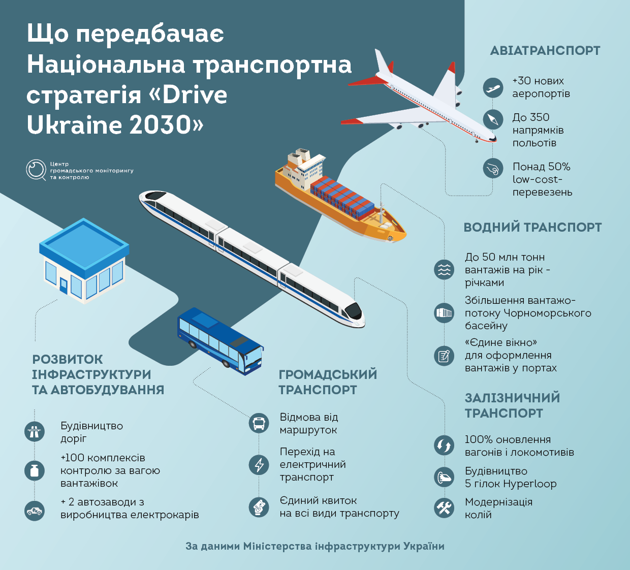 В українському уряді планують зробити те саме за 12 років. Вже у 2030 році громадський транспорт в Україні повинен бути винятково електричним. Це передбачено новою Національною транспортною стратегією «Drive Ukraine 2030», яку Кабмін ухвалив напередодні літа. Які ще нововведення будуть запроваджені в Україні, проаналізували експерти Центру громадського моніторингу та контролю.