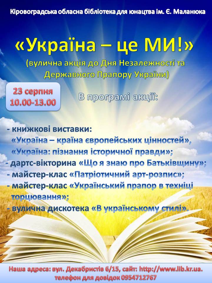 З нагоди свят Кіровоградська обласна бібліотека для юнацтва ім. Є. Маланюка запрошує містян на вуличну акцію «Україна – це ми!». Акція відбудеться 23 серпня з 10.00 до 13.00 на вулиці Дворцовій (біля приміщення бібліотеки).