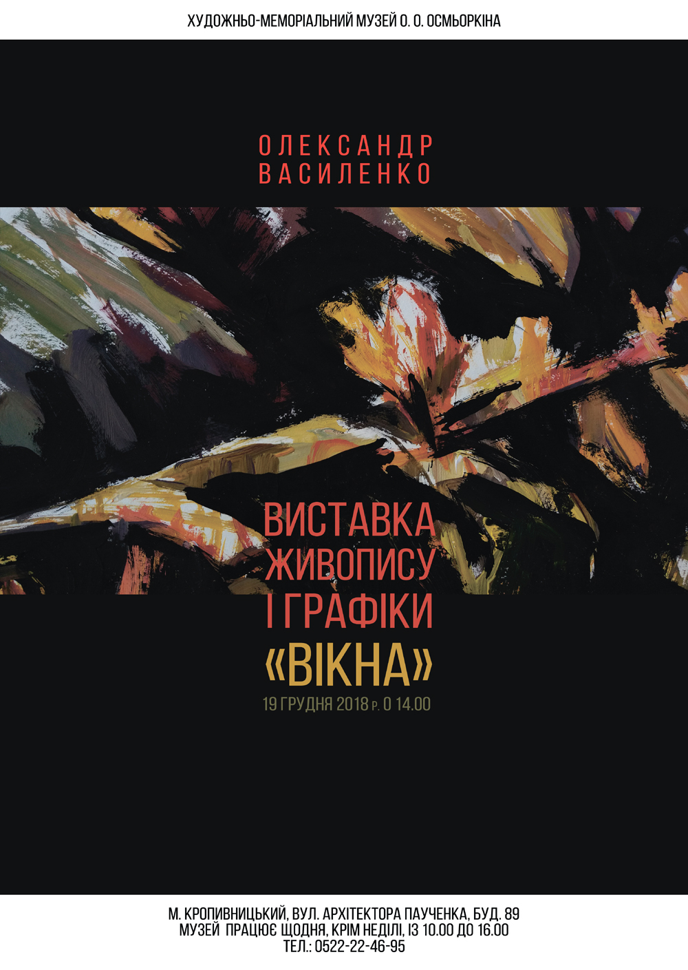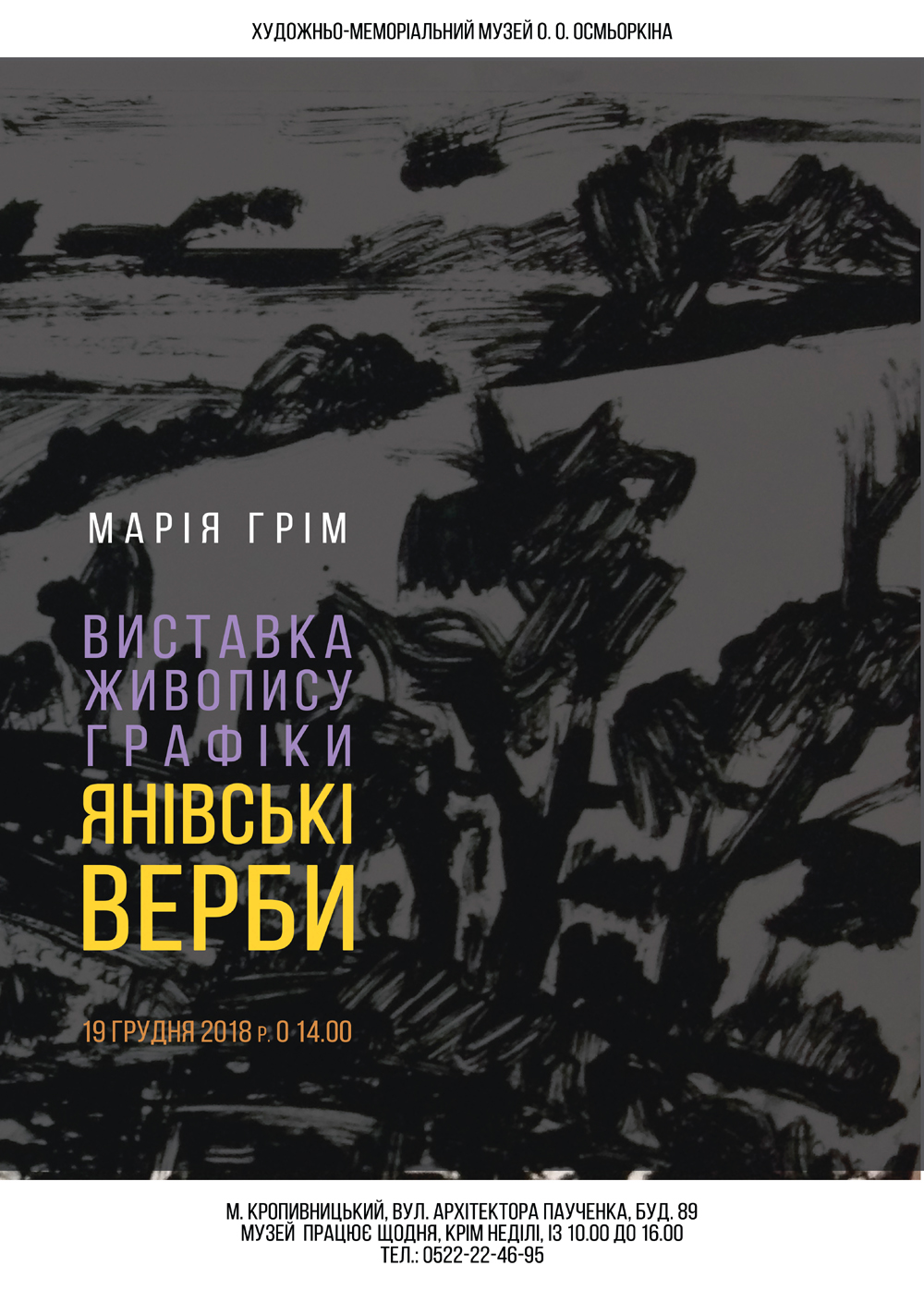19 грудня 2018 р. о 14-00 год. в художньо-меморіальному музеї О.О.Осмьоркіна відбудеться відкриття спільної персональної виставки живописних та графічних творів художників з міста Дніпра Олександра Василенка «Вікна» та Марії Грім «Янівські верби».