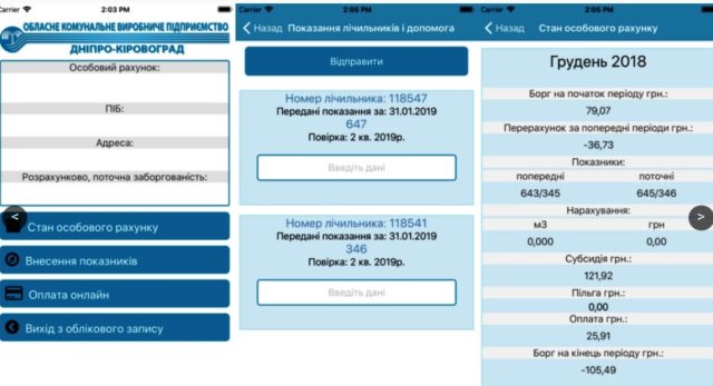 Також користувачам додатку надається можливість отримувати повідомлення про успішну передачу показників лічильника, про зміну тарифів, платежі і заборгованості.