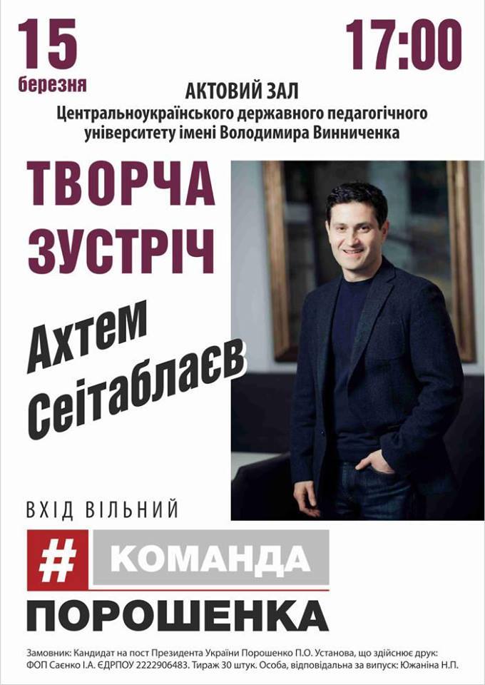 15 березня о 17.00 в актовому залі ЦДПУ імені Володимира Винниченка відбудеться творча зустріч з українським актором та режисером Ахтемом Шевкетовичем Сеітаблаєвим.