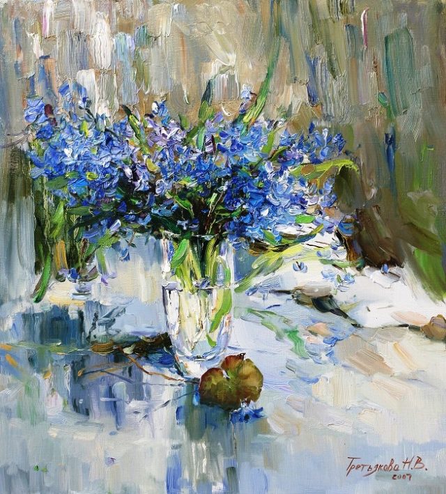 Наталія Третьякова віддає перевагу натюрморту. Вона наповнює кожну роботу романтичним оспівуванням краси квітів. Барви бутонів створюють власну візуальну поезію на тлі, що грає сонячними відблисками.