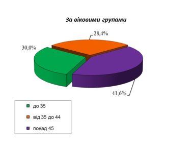 За віковими групами: 30,0% зареєстрованих безробітних були у віці                            до 35 років; 28,4% – у віці від 35 до 45 років; 41,6% – у віці понад 45 років.