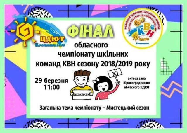 29 березня об 11.00 на базі Кіровоградського обласного центру дитячої та юнацької творчості відбудеться фінальний етап обласного чемпіонату шкільних команд КВК сезону 2018/2019 н.р.