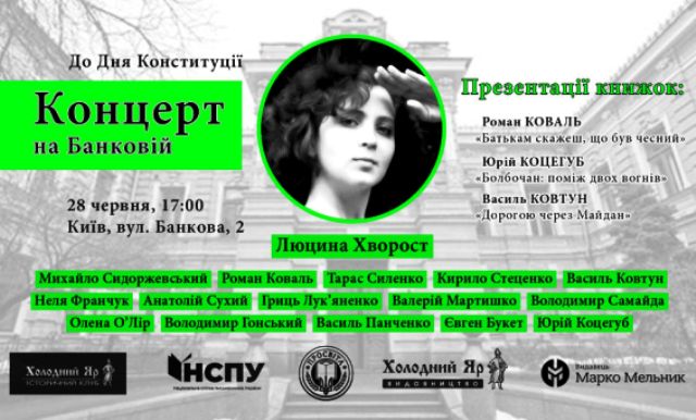28 червня 2019 р. Історичний клуб “Холодний Яр” та Національна спілка письменників України запрошують киян і гостей столиці на мистецький захід під назвою “Концерт на Банковій”, який відбудеться на ґанку Будинку літераторів (вул. Банкова, 2).