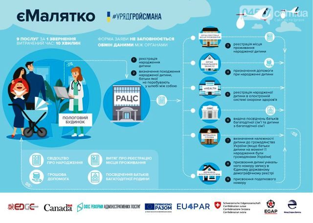 – «єМалятко» – можливість отримати 10 послуг держави, пов’язаних з народженням дитини, за однією електронною заявою одразу в пологовому будинку. Передбачено зменшення кількості необхідних візитів з 11 до нуля, а кількості документів, що вимагаються, – з 37 до одного.