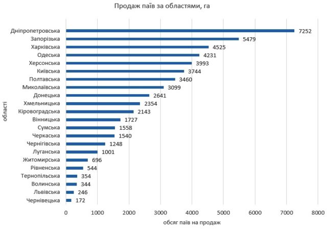 За розрахунками автора, найбільше пайової землі продають у Дніпропетровській області — 7 252 га.