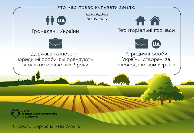Хто має право купувати землю? Відповідно до закону, сільськогосподарські угіддя можуть купувати: українські громадяни; юридичні особи України, створені за законодавством України; територіальні громади; держава. Крім того, право на придбання землі мають юридичні особи, кінцевими власниками яких є іноземці, якщо вони орендують землю в Україні більше трьох років. Інші іноземці та іноземні компанії зможуть купувати землю з 2024 року.