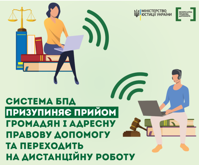 З 23 березня 2020 року і до завершення карантину система безоплатної правової допомоги призупиняє особистий прийом громадян та надання адресної правової допомоги. У цей період система БПД надаватиме правові послуги дистанційно.