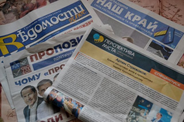 І хоч кандидати лише закінчують реєструватися, але вже зараз на вулицях можна побачити розмаїття інформаційних площ, які використовують у своїх рекламних кампаніях політики: це білборди і сіті-лайти, агітаційні листівки і газети. Про сумнівні зображення, агітацію на лавках та чорний піар «НС» розповідало у попередніх номерах (читайте у номері від 10 вересня 2020 року статтю «Адмінресурс і чорний піар: на Кіровоградщині стартували вибори»). Наразі ж в обласному центрі з’явилися агітаційні намети політичних сил, де роздають не лише листівки, а й газети – як авторитетні та пізнавані видання, так і вже давно забуті. Тож же за першими шпальтами стає зрозуміло, хто пробуватиметься в кандидати – навіть якщо відповідного запису у виборчій комісії ще немає.
