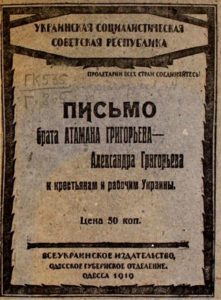 Якось випадково в інтернеті я натрапив на вельми цікавий документ під назвою «Письмо брата атамана Григорьева – Александра Григорьева к крестьянам и рабочим Украины», надрукований в Одесі у 1919 році. Виданий у вигляді брошури (8 сторінок, ціна 50 копійок) цей лист зберігається у Державній публічній історичній бібліотеці Росії.