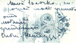Перед моїми очима виникла молода, вродлива, акуратно зачесана жінка у сукні чи то блузці з безліччю складок та рюшів. На зворотньому боці – теж доволі рідкісна графіка фоторобітні Харлаба, саме цієї композиції мені досі ще не зустрічалося. Але з написом, що містив досить цікаву інформацію, бо, уважно вчитуючися в не зовсім розбірливі літери, написані синім чорнилом, відкрив для себе таке: «Милой Галочке, хорошей моей ученичке от любящей учительницы Ольги Нейгауз…» (шкода лише, що без часового датування!)
