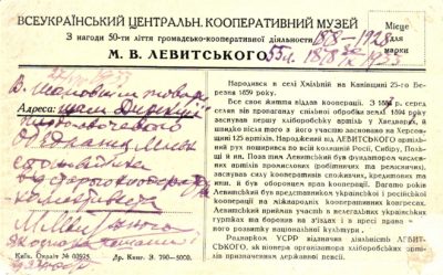 Другою знахідкою виявилася досить рідкісна поштівка, видана Всеукраїнським центральним кооперативним музеєм далекого1928 року з портретом Миколи Васильовича Левитського (1859 – 01. 12. 1936), чиє ім’я знедавна носить одна із вулиць нашого обласного центру, з нагоди 50-річчя його громадсько-кооперативної діяльності.