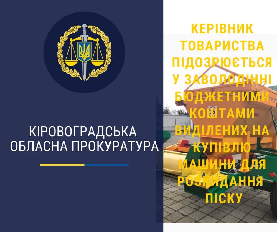 За процесуального керівництва Кіровоградської обласної прокуратури повідомлено про підозру керівнику товариства з обмеженою відповідальністю за фактом заволодіння ним бюджетними коштами у сумі 165 тисяч гривень (ч. 3 ст. 191 КК України).