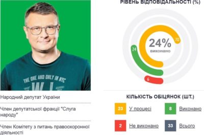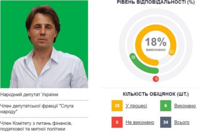 Ще один «Слуга народу» Юрій Кузбит у своїй передвиборчій програмі дав 34 обіцянки, з яких виконав шість, а 28 – в процесі реалізації. Серед підвішених завірянь – низка обіцянок у підписаному меморандуму партії. Вже зараз Кузбит може звітувати, що таки голосував за законопроєкти щодо захисту і заохочення викривачів корупції, скасування депутатської недоторканності та спрощення процедури імпічменту, свавілля податківців і правоохоронців щодо бізнесу. Чи були ухваленні ці законопроєкти та чи мали в собі раціональне зерно – то вже інше питання. Але тут обіцяне було виконано.