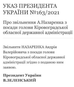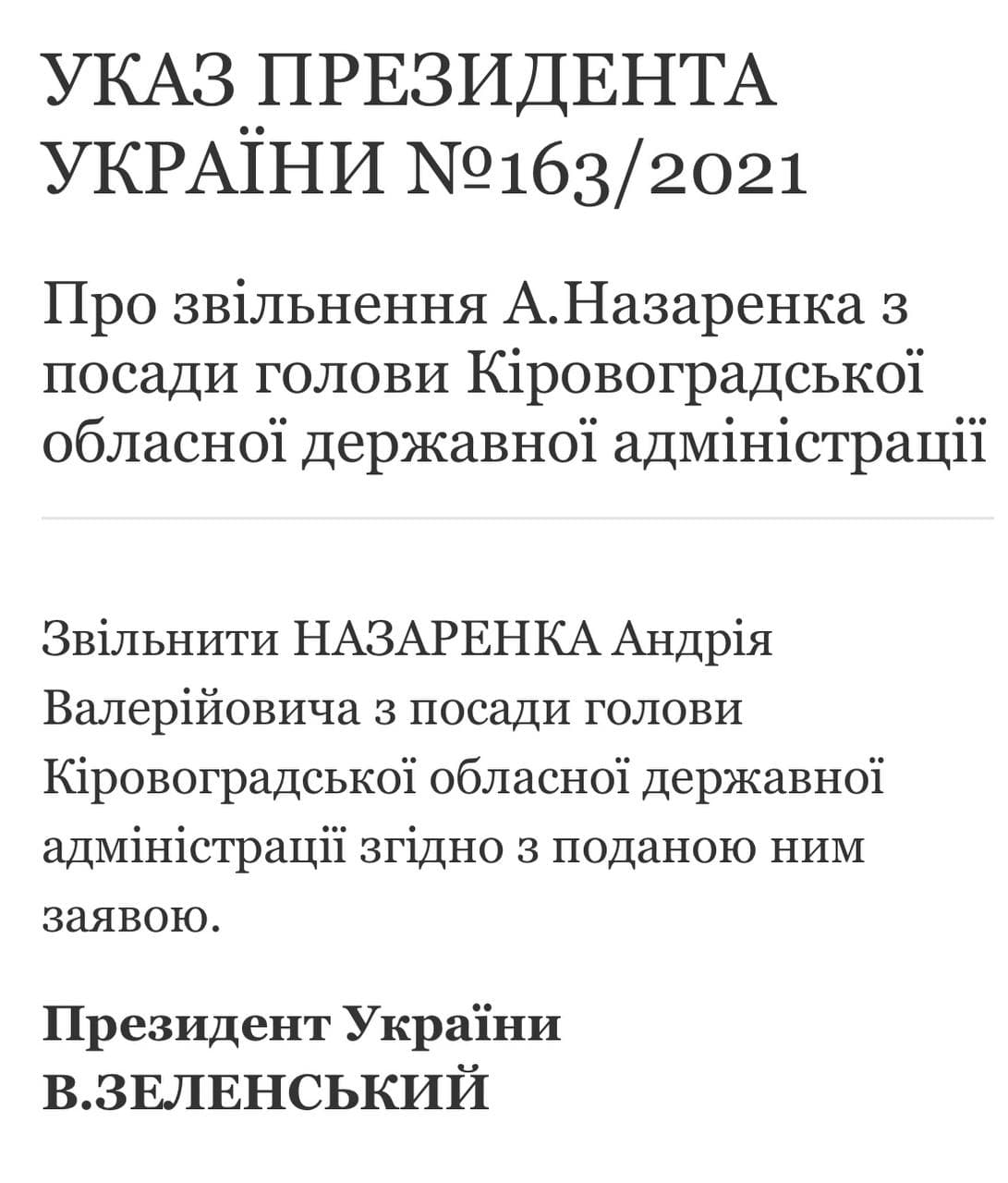 Президент підписав наказ про звільнення голови Кіровоградської ОДА Андрія Назаренка.