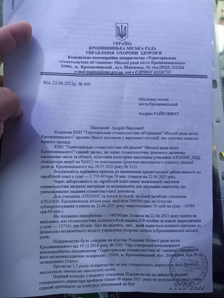 Назване підприємство обслуговує цілу низку різних категорій пільговиків, у тому числі – учасників АТО/ООС та членів їхніх сімей. Для них міською радою Кропивницького виділено 200 тисяч гривень на безплатне протезування. Тобто ці кошти жодним чином не мають впливати на фінансовий стан поліклініки. Разом з тим, на лікування пільговиків виділено більше 149 тисяч, але гроші ще не надійшли, тож послуги надавалися за кошти лікарні.
