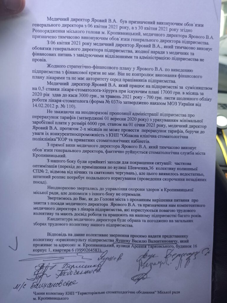 Колектив вважає, що така ситуація склалася через бездіяльність керівника – медичного директора Володимира Ярового, який був призначений виконуючим обов’язки генерального директора 6 квітня цього року, а 30 квітня – розпорядженням міського голови – тимчасово виконуючим обов’язки генерального директора підприємства. От з того часу підприємство й почало бути збитковим. Але, як запевняють члени колективу у зверненні до Андрія Райковича, в цьому провина саме Ярового – мовляв, керівник, нехай і у статусі т.в.о., «нічого не робив, аби вивести підприємство з кризи». До речі, сам він при заробітній платі у 17 тисяч гривень здав до каси лише 700 гривень за травень. Бездіяльність керівника, порахували підлеглі, призвела до того, що накопичився борг по заробітній платі у майже два мільйони гривень.