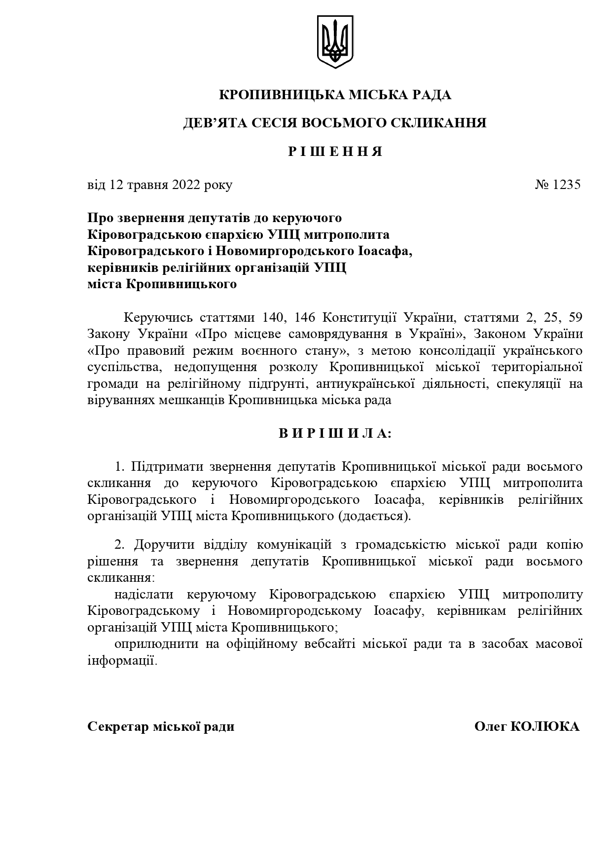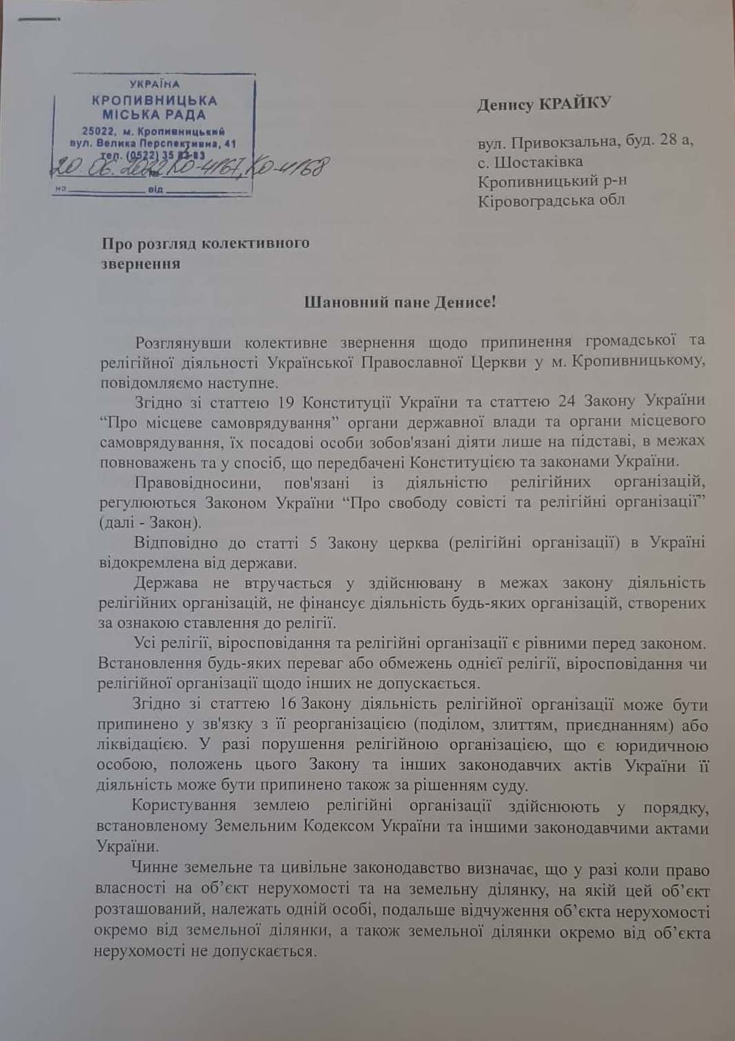 Власне кажучи, нічого неочікуваного: посадовці зазначають, що не мають ані прав, ані повноважень, ані підстав для позитивної реакції на вимоги звернення. І нагадують про рішення міськради від 12 травня №1235 «Про звернення депутатів до керуючого Кіровоградською єпархією УПЦ митрополита Кіровоградського і Новомиргородського Іоасафа, керівників релігійних організацій УПЦ міста Кропивницького». Ось його фрагмент: «Третій місяць, як росія розпочала широкомасштабну активну фазу російсько-української війни, що триває з 2014 року, водночас у Кропивницькому продовжує діяти офіційна структура російської православної церкви – це Українська православна церква (далі – УПЦ). Підтвердженням є статут УПЦ, в якому зазначено, що УПЦ – самокерована частина російської православної церкви (Московський патріархат – розділ 1. пункт 5).