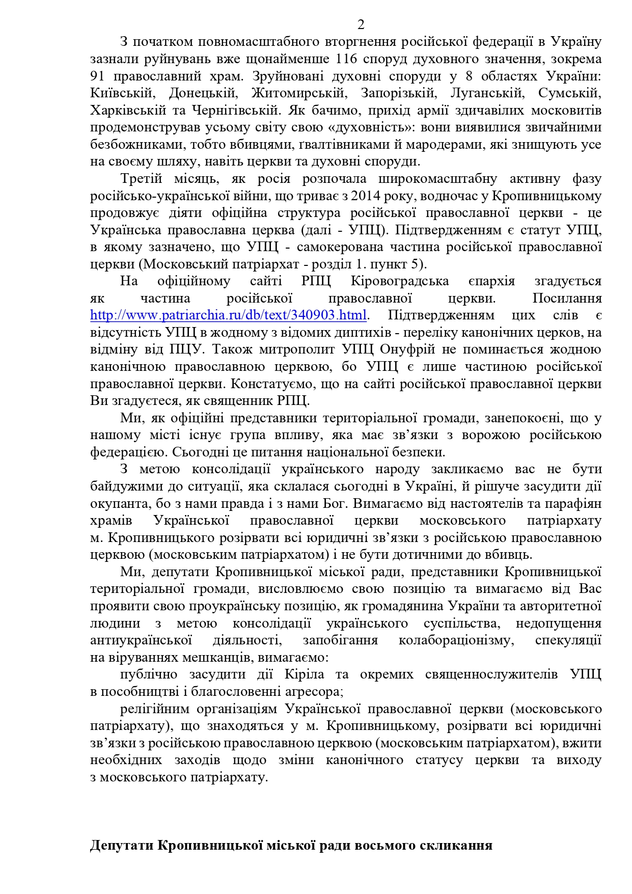 «В той час, коли наша країна потерпає від широкомасштабної війни, яку розв’язала Російська Федерація, коли кожного дня гинуть сотні українців, як воїнів, так і цивільних громадян, на теренах нашого міста продовжує безперешкодно функціонувати релігійна організація, яка напряму керується з Москви. Йдеться про так звану Українську православну церкву. Незважаючи на неодноразові звернення до духовних осіб цієї організації про вихід з підпорядкування патріарху Кирилу (Гундяєву), який є одним з головних ідеологів вторгнення Російської Федерації та безумовно несе відповідальність за всі криваві злочини та порушення законів війни, що творять російські війська в ході так званої «спецоперації», церковні організації м. Кропивницький продовжують знаходитись у складі Української православної церкви. Щоб знешкодити підривну діяльність цієї організації, направлену на знищення самої можливості існування незалежної Української держави, вимагаємо негайно припинити будь-яку громадську та релігійну діяльність Української православної церкви в м. Кропивницькому, а також – в межах свої повноважень – передати землю, будівлі та майно, що належать або використовуються Українською православною церквою чи Російською Православною Церквою в Україні, та передати Православній Церкві України».