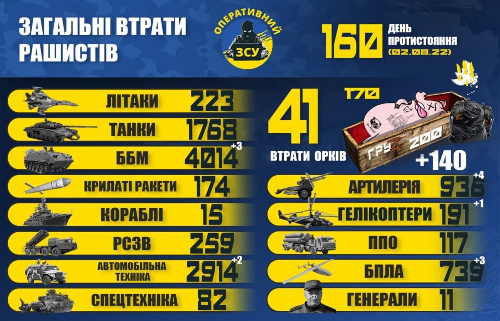 ЗАГАЛЬНІ БОЙОВІ ВТРАТИ ПРОТИВНИКА З 24.02 ПО 02.08 02.08.2022 0 308 views Генштаб ЗСУ оприлюднив свіжу інформацію щодо втрат держави-агресора з початку війни з Україною. RELATED ARTICLESMORE FROM AUTHOR ГАЗЕТА “НАРОДНЕ СЛОВО” №40 ВІД 2 ЖОВТНЯ 2025 РОКУ ГАЗЕТА “НАРОДНЕ СЛОВО” №39 ВІД 25 ВЕРЕСНЯ 2025 РОКУ ГАЗЕТА “НАРОДНЕ СЛОВО” №38 ВІД 18 ВЕРЕСНЯ 2025 РОКУ LEAVE A REPLY Cancel replyLog in to leave a comment