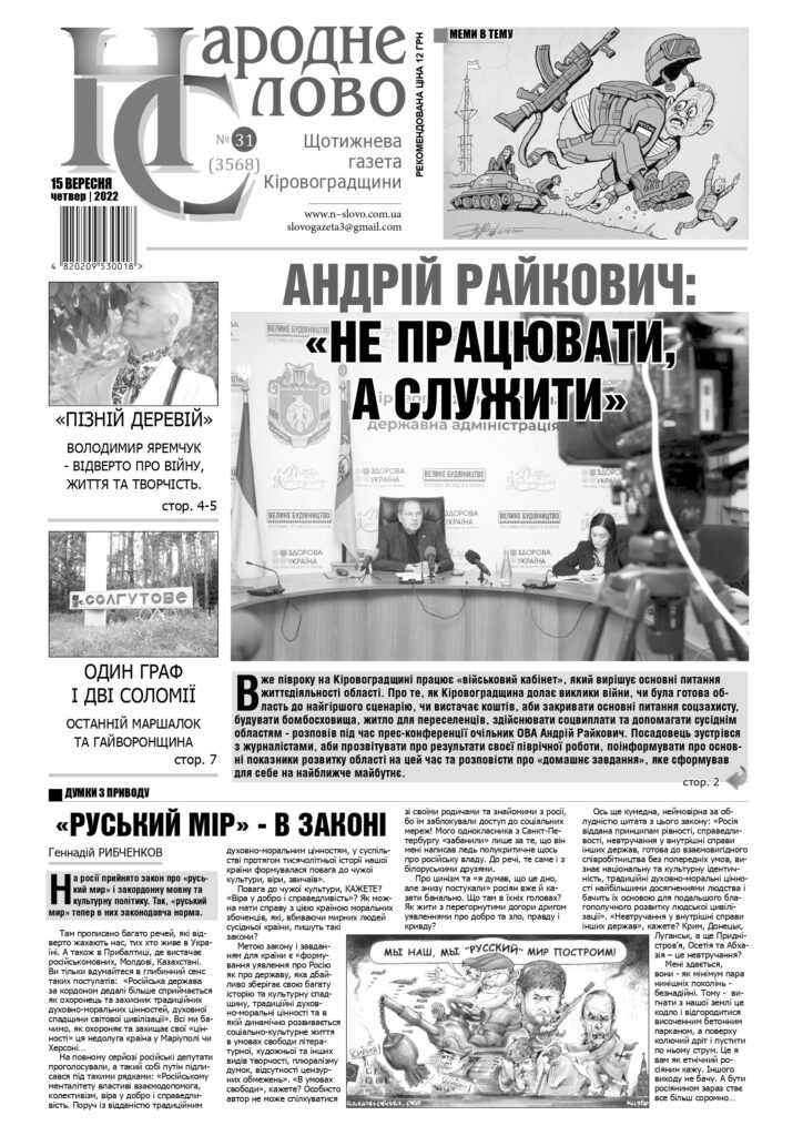 ГАЗЕТА “НАРОДНЕ СЛОВО” №31 ВІД 15 ВЕРЕСНЯ 2022 РОКУ