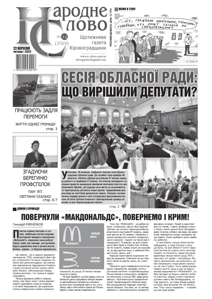 ГАЗЕТА “НАРОДНЕ СЛОВО” №32 ВІД 22 ВЕРЕСНЯ 2022 РОКУ
