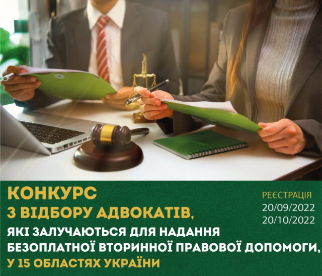 Оголошено конкурс з відбору адвокатів, які залучаються до надання безоплатної вторинної правової допомоги, в 15-ти областях України.