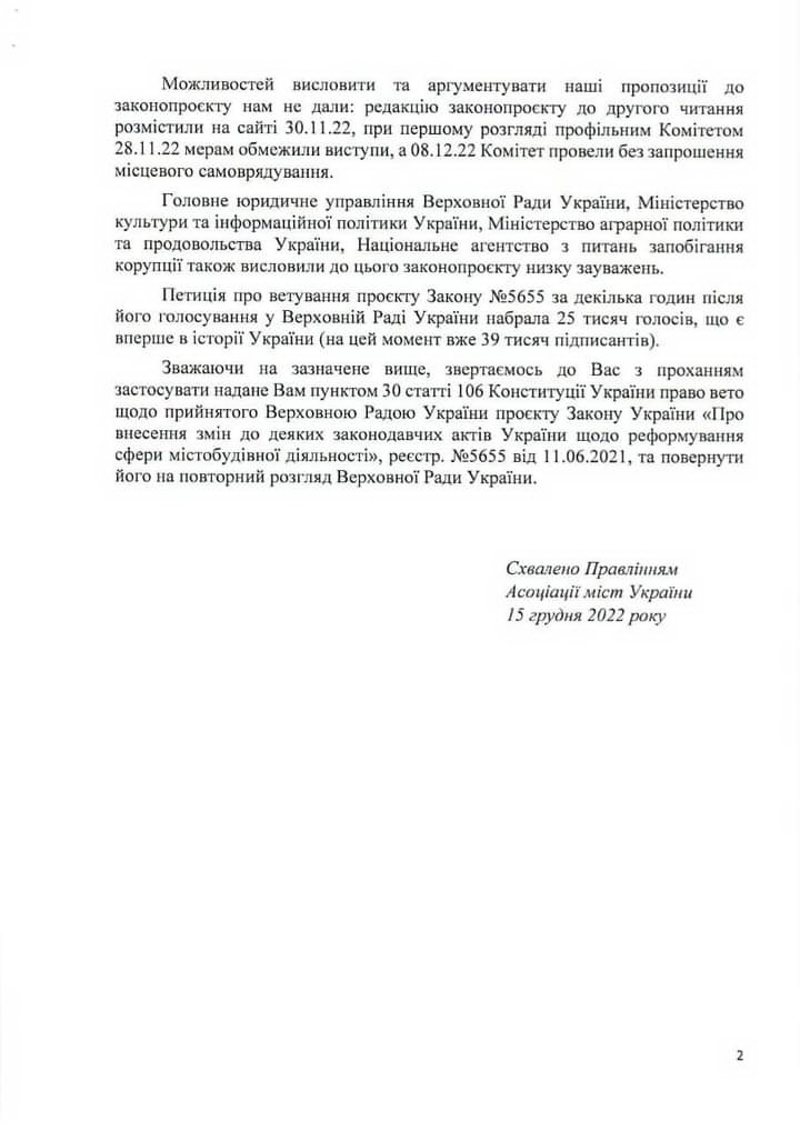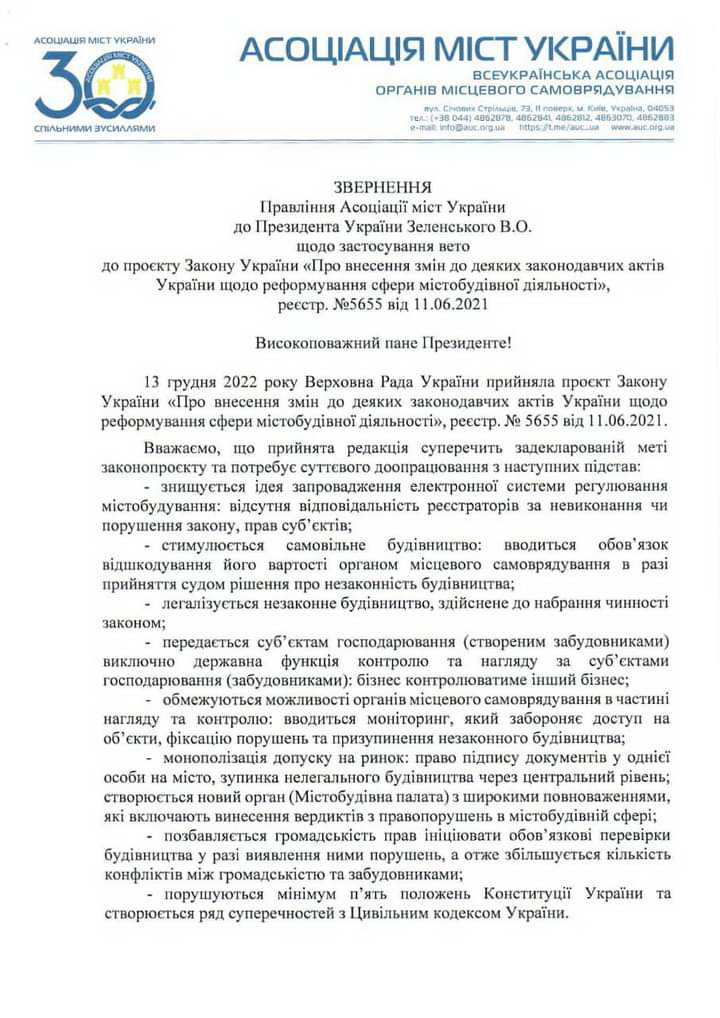 Асоціація міст України звернулася до Президента України Володимира Зеленського про застосування ним права вето щодо прийнятого Верховною Радою України проєкту Закону України «Про внесення змін до деяких законодавчих актів України щодо реформування сфери містобудівної діяльності» №5655 від 11.06.2021.
