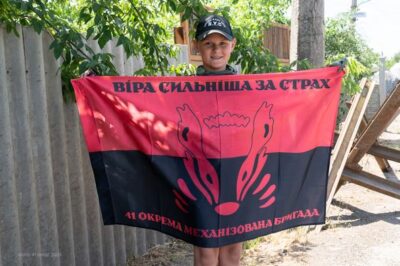 Школяр Захарчик із прапором нашої 41-ї окремої механізованої бригади на вулиці зустрічає та вітає українських військових. Хлопчик каже, що є юним волонтером, а ще допомагає своїй матері та збирає їй на подарунок!
